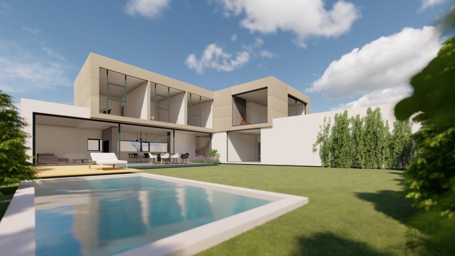 Eine großzügige Raumaufteilung mit lichtdurchfluteten Schlafräumen und trotzdem ausreichend Privatsphäre waren Vorgaben der Bauherren, die durch die L-Form hervorragend umgesetzt werden konnten. Von innen genießt man aus allen Räumen den ungehinderten Blick in den Garten mit Pool.