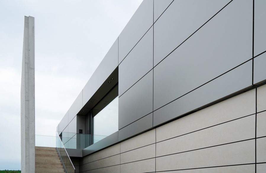 Der u-förmige, zweigeschossige Baukörper fügt sich in die stark ansteigende Topografie des Grundstücks ein. Die klar gegliederte Aluminiumfassade setzt einen Kontrapunkt zur umgebenden Bebauung und stärkt die Form des einfachen Kubus. Ein spannendes Projekt ist jetzt online! Link zum Projektbericht