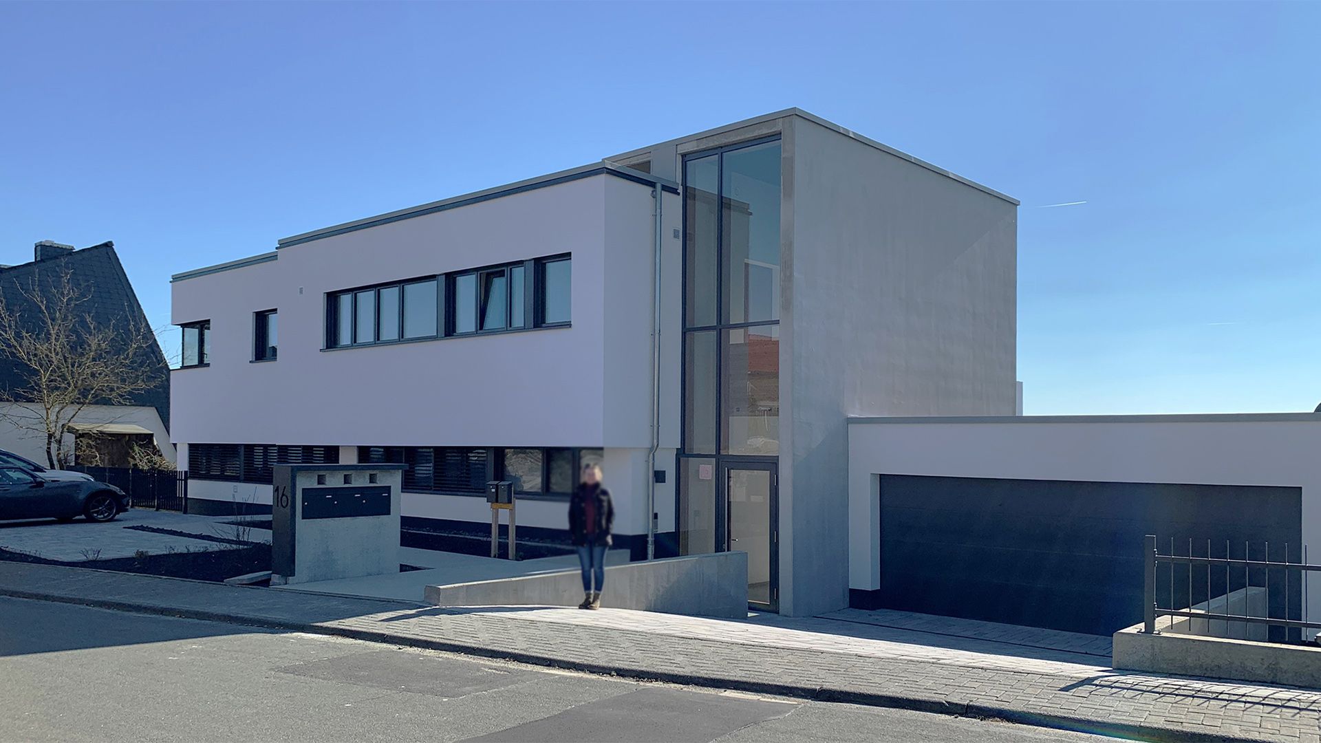 Ein exklusives Heim für eine sechsköpfige Familie. Ein Spiel aus zwei Kuben in zwei- und dreidimensionaler Ebene inklusive Autoaufzug und verglastem Personenaufzug.