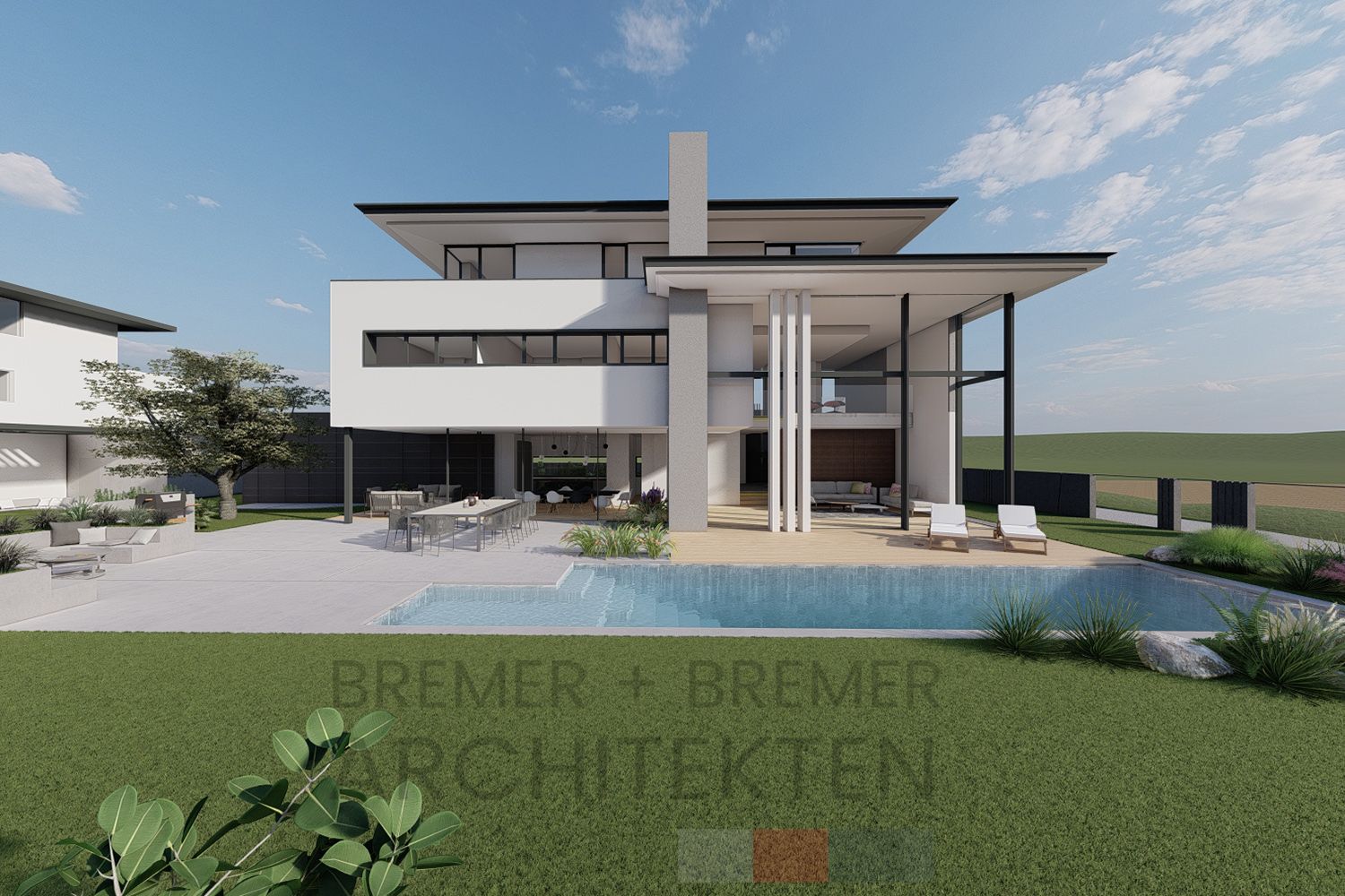 Die von Bremer + Bremer entworfene Villa einer 6-köpfigen Familie befindet sich unmittelbar am Feldrand. Konzipiert als Spiel mit Kuben in zwei und dreidimensionaler Ebene mit einer Architektur im Bauhausstil. Klare Linien und Formen, wenig Materialwechsel geben dem exklusiven Ambiente einen noch edleren Charakter und sind so gewählt, dass der Wechsel zwischen Beton, Holz und Glas eine perfekte Harmonie zwischen Innen und Außen bildet.
