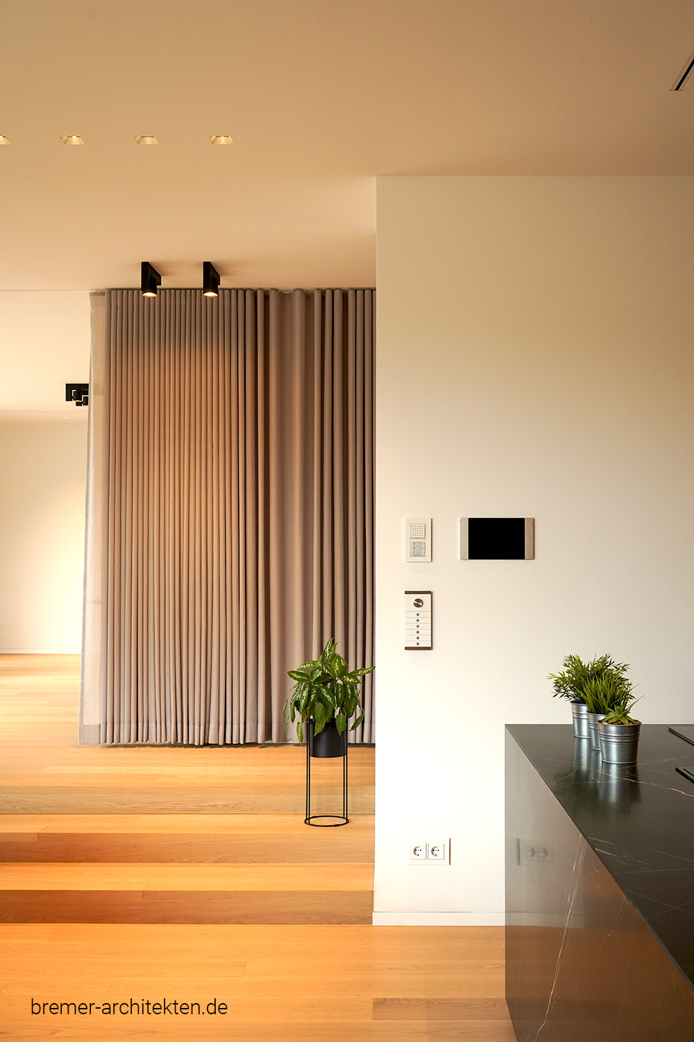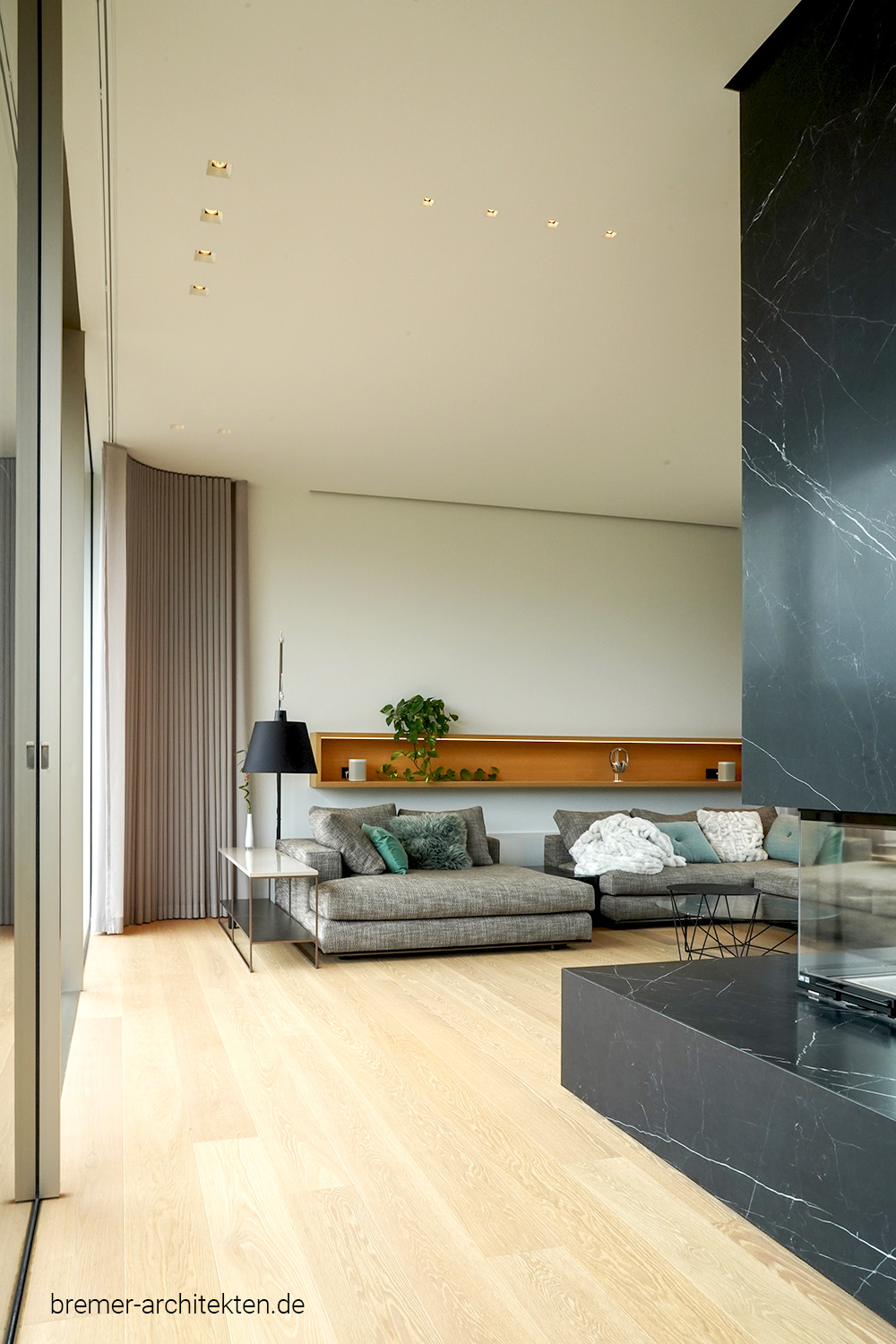 Raumhohe Türen und Einbauschränke in Naturmaterialien sowie die Verwendung von edlen Oberflächen für Küche und Kaminverkleidung, bilden exklusive Gestaltungsformen und schaffen die Basis für reduzierte, zeitlose Einrichtungselemente.