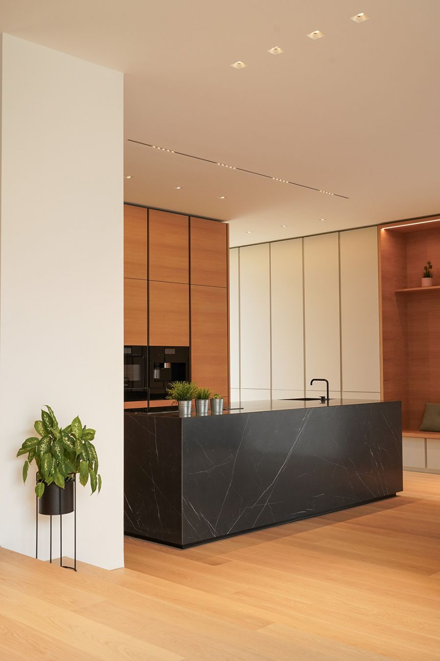 Die exklusive Wohnküche wurde aus hochwertigem Feinsteinzeug und Eichenholzfronten maßgefertigt. Der schwarze, wie aus einem Guss gefertigte Inselblock definiert den zentralen Treffpunkt im Wohnbereich.