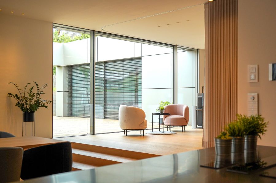 Die offenen, rahmenlosen Glasfronten ermöglichen einen umwerfenden Fernblick. Das dreiseitig umschlossene Atrium bildet den Kern des Gebäudes. Mit einem Holzdeck belegt, sorgt es für Privatsphäre unter freiem Himmel und schafft reizvolle Durchblicke durch das gesamte Haus.